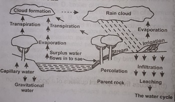 (a) Draw an annotated diagram of a water cycle. (b) State six importance of water to crops. (c) State four ways of conserving water in the soil.
