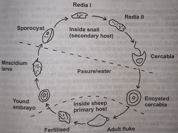 Liver fluke: The adult fluke is found in the bile duct of animals where it feeds and reproduces. The adult fluke reproduces eggs in the bile duct of the animal which are pass out with faeces from the primary host (Cattle, sheep etc) If the eggs and faeces are passed out by the ruminant into water, they develop to a larva called miracidium which will later hatch ten days later. This larva swims in the water, looks for a snail which is its secondary host (usually Limnea truncatula). It penetrates the snails skin or the pulmonary hole. It develops to a sporocyst within the snail. Through asexual reproduction the sporocyst reproduces a larva called radial. The radial ruptures from the sporocyst and migrate to the digestive gland of the snail. Here it grows to a final larva called cercaria. After six weeks this cercaria leaves the snail through the pulmonary hole and swims to look for the final host in the water. The cercaria is ingested by the ruminant through infested pasture or water. Then in animal stomach, it makes its way to the animal liver to the bile duct through the liver tissues. It grow to an adult fluke in the animal's bile duct
