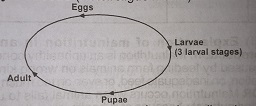 (iii) The larvae undergo three stages (moulting) before becoming pupae.