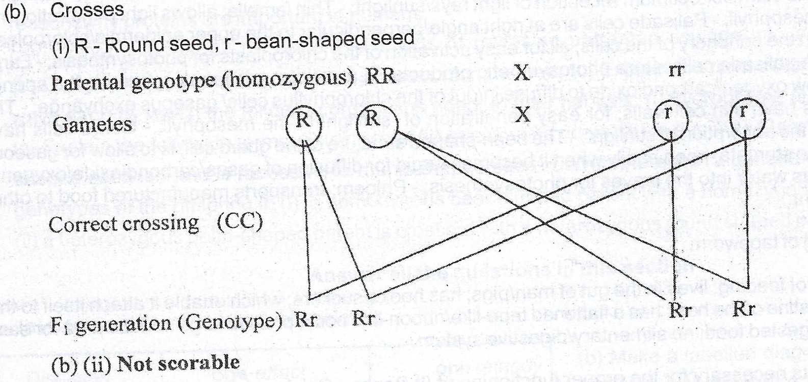 (b) In a mango plant the, the allele for bean-shaped seed is r and is recessive to round-shaped seed R. With the aid of a genetic diagram, determine the genotypes of the offspring if: