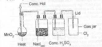 (a)(i) Draw a labelled diagram for the laboratory preparation of a dry sample of chlorine