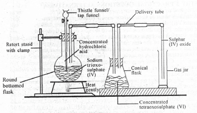 (a)(i) A labelled diagram for the laboratory preparation of a dry, sample of sulphur (iv) oxide.