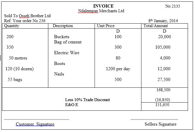 From the following items purchased from Ndalempan Merchants Ltd, prepare an invoice to Osseh Builders Ltd