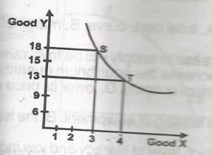 To produce 18 units of Y, at point S, 3 units of X was produced at the same point S. A movement along the production chart from point S to T, the firm gave up 5 units of Y to produce 4 units of X. This means that the firm gave up 5 units of product Y to produce 1 additional unit of X.