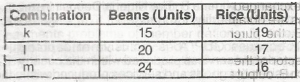 The table above shows the combinations of beans and rice that can be purchased by a consumer. The opportunity cost of moving from K to L is