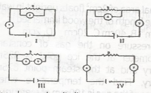In the above circuit diagrams A is the ammeter and V is the Voltmeter. Which of the circuits is correct for finding the correct value of the resistance R