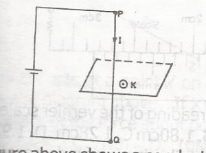 The fig above shows a conductor PQ carrying a current I in the direction shown. At a particular position near the conductor is a compass needle K. Neglecting the earth’s magnetic field, the compass needle will