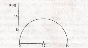 A body is under action of a force F such that the force displacement graph of the body is semi circular as shown above. The work done on the body by the force in moving through 24 meters is