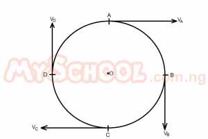 A piece of stone attached to one end of a string is whirled round in a horizontal circle and the string suddenly cuts. The stone will fly off in a direction