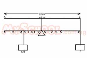 A 90cm uniform lever has a load of 30N suspended at 15cm from one of its ends. If the fulcrum is at the center of gravity, the force that must be applied at its other end to keep it in horizontal equilibrium is