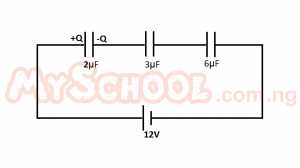 The figure above shows three capacitors, 2μF, 3μF and 6μF connected in series. If the p.d across the system is 12V, the p.d, across the 6μF capacitor is