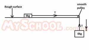 In the figure above, the coefficient of static friction is 0.5. If the tension in the string is T, the acceleration of the system in motion is