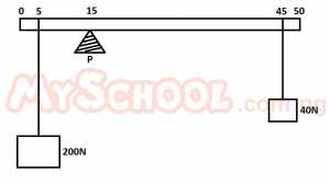 In the diagram above, a rod 50 cm long of uniform cross-section is suspended horizontally on a fulcrum, F, by the action of two forces. What is the weight of the rod?