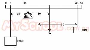 In the diagram above, a rod 50 cm long of uniform cross-section is suspended horizontally on a fulcrum, F, by the action of two forces. What is the weight of the rod?