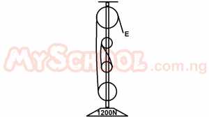 The efficiency of the pulley system shown above is 80%. find the effort E required to lift the load of 1200N