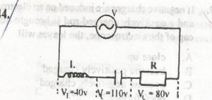 From the diagram above, if the potential difference across the resistor, capacitor and inductor are 80 v, 110 v, 40 v respectively, the effective potential difference is?