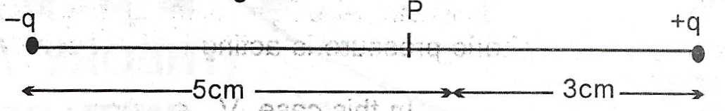 (b) Two similar but opposite point charges -q and +q each of magnitude \(5 \times 10^{-8} C\) are seperated by a distance of 8.0cm in vacuum as shown in the diagram below.