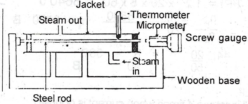 The apparatus is set up as shown above. The length of the steel rod used is first measured with a meter rule and it is then placed in the jacket with one end fixed. The micrometer screw gauge is turned until the end of the screw just touches the end of the rod, and the gauge reading is noted. It is then turned back enough to make sure that the end of the rod can expand freely. The reading on the thermometer is noted and steam is now passed through the jacket for several minutes. The micrometer is used to note the new reading. More steam is passed again and the reading is taken until a constant reading is obtained. The reading is noted and the temperature is noted from the thermometer.
