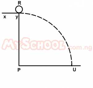 An object R leaves a platform XY with a horizontal velocity of 7m-1 and lands at Q. lf it takes the same object 0.3s to fall freely from Y to P, calculate the distance PQ.(Take g = 1Oms2)