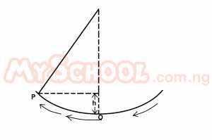 An oscillating pendulum has a velocity of 2ms-1 at the equilibrium position O and velocity at same point P. Using the diagram above, calculate the height of P above O. (Take g = 10ms2)