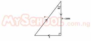The body P shown in the diagram above is in equilibrium. If the mass Q of the body is 10kg, calculate the tension T in the string. (Take g = 10ms2)
