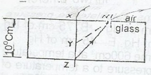Calculate the refractive index of the material of the glass block shown in the diagram if YZ = 4cm