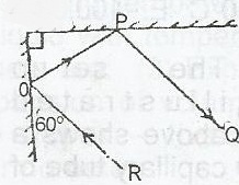 Two mirrors are inclined as shown in the diagram. A ray of light RO strikes the arrangement at O and emerges along PO. The emergent ray has been deviated through