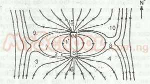 The diagram above shows the magnetic field around a bar magnet which has its N-pole pointing north. The neutral points in the field are likely to occur at