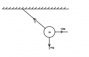 A body of mass m = 0.5 kg is suspended by a string and pulled by a horizontal force of 12N as shown in the diagram. Calculate the tension T in the String if the body is in equilibrium. [Take g as 10ms\(^{-1}\)]