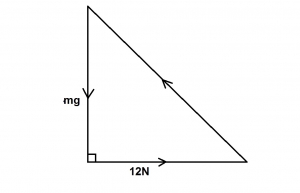 A body of mass m = 0.5 kg is suspended by a string and pulled by a horizontal force of 12N as shown in the diagram. Calculate the tension T in the String if the body is in equilibrium. [Take g as 10ms\(^{-1}\)]