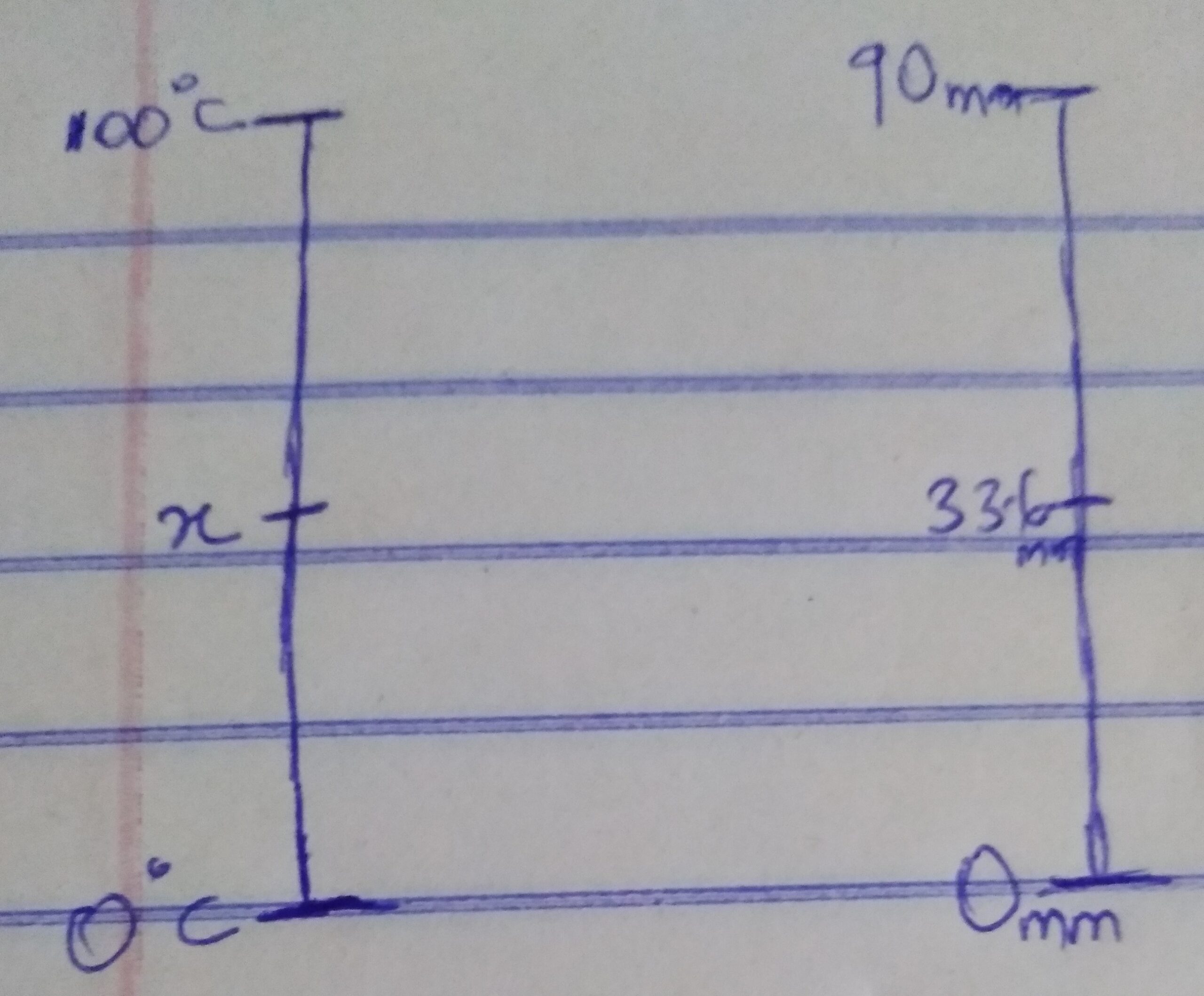 The ice and steam points on a mercury in glass thermometer are found to be 90mm apart. What temperature is recorded in degree Celsius when the length of the mercury thread is 33.6mm above the ice point mark?