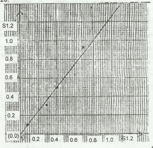 The graph above shows the relationship between sin i and sin r for a ray of light in air incident on a liquid surface. If i and r are respectively angles of incidence and refraction, deduce the refractive index of the liquid from the graph
