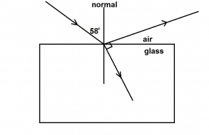 A ray of light is incident on a glass block as shown in the diagram above. If the reflected and the retracted rays are perpendicular to each other, what is the refractive index of the glass relative to air.?