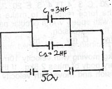 (d) Two parallel-plate capacitors of capacitances 2\(\mu\)F and 3\(\mu\)F are connected in parallel and the combination is connected to a 50V d.c. source. Draw the circuit diagram of the arrangement and determine the: