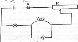 (a)(i) Describe, with the aid of a circuit diagram, an experiment to measure the resistance of a wire given an ammeter of low resistance, a battery, a key, a rheostat, va high-resistance voltmeter and some connecting wires.