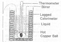 Method Weigh empty calorimeter plus stirrer and record the mass M\(_1\), weigh empty calorimeter plus stirrer plus water and record the mass m. Weigh copper ball and record the mass Mc. Take the initial temperature of the water T\(_1\). Heat copper ball in water to temperature T and record T. Quickly transfer the copper ball into the calorimeter and stir. Take the final temperature of the mixture T\(_2\). Heat lost by copper ball = Heat gained by calorimeter; water and stirrer.