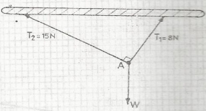 An object A is held in equilibrium as illustrated in the diagram above. Using the data on the diagram determine the magnitude, W of the weight of