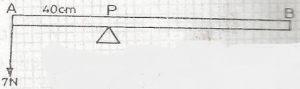 In the diagram above, AB represents a uniform rod of length 1.50m which is in equilibrium on a pivot at P, If AP = 40cm, calculate the mass of the rod. [g = 10ms-2]