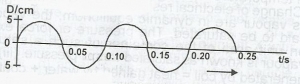 The diagram above represent displacement D, versus time, t graph of a progressive wave. Deduce the frequency of the wave