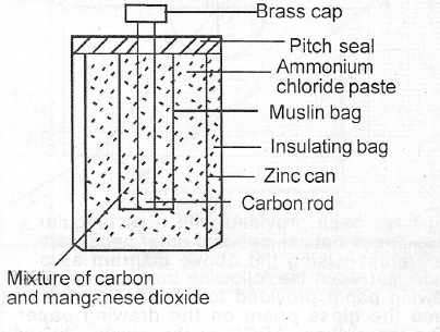 (b) Draw a labelled diagram to show the essential parts of a dry leclanche cell.