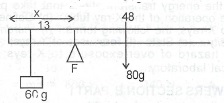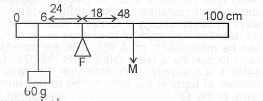 (b) A metre rule is found to balance horizontally at the 48 cm mark. When a body of mass 60 g is suspended at the 6 cm mark, the balance point is found to be at the 30 cm mark. Calculate the;