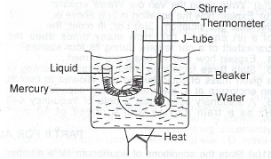 Add and trap a few drops of the liquid in the closed limb of the J-tube above the mercury. Insert into a beaker of water the J-tube, stirrer and thermometer. Heat the beaker and content and stir continuously. Then read and record the temperature at which the mercury levels in the two limbs are the same. Heat the beaker a little further and remove heat source. Also read and record the temperature at which the mercury levels are once again the same. The average of the two temperature values is the boiling point of the liquid.