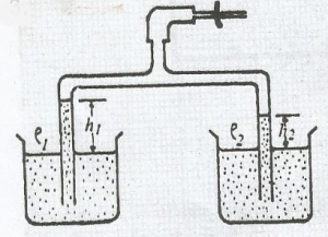 The diagram above illustrates a Hare’s apparatus. \(\mathit{e}_1, \mathit{e}_2\) represent densities and \(\mathit{h}_1, \mathit{h}_2\) heights of columns of liquids. Which of the following equations is correct?
