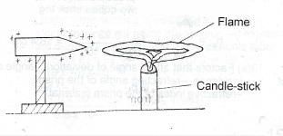 When a positively charged conductor is placed near a candle flame, the flame spreads out as shown in the diagram above. Explain this observation.