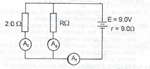 The diagram above illustrates a 9.0 V battery of internal resistance 0.5 \(\Omega\) connected to two resistors of values 2.0 \(\Omega\) and R \(\Omega\). A\(_1\) A\(_2\) and A\(_3\) are ammeters of negligible internal resistances. If Al reads 4.0 A, calculate the: