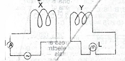 The diagram above illustrates two coils X an arranged so that their axes are collinear. X is connected to an a.c. supply and has an amme in series with it while Y is connected to a lamp Explain the following observations. The (i) lamp is lit when the a.c. supply is switched on;