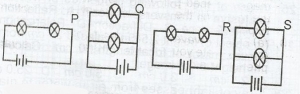 Two similar cells are used to light two similar lamps as illustrated in the diagrams above. In which of the circuit diagrams are the lamps brightest?
