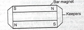 (c) Magnets are stored in pairs with their poles adjacent, placing soft iron pieces called keepers across their ends. The keepers become magnets by induction decreasing the reluctance of the air gap; hence both magnets and keepers form closed loops with no free poles preventing demagnetization
