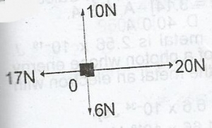 Four co-planar forces of magnitudes 10N, 17N, 6N and 20N act at point O as shown in the above diagram. Determine the magnitude of the resultant force