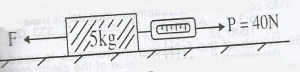 A block of wood of mass 5kg is pulled on a platform by a force of 40N as illustrated in the diagram above. If the frictional force, F experienced by the block is 12N, calculate the magnitude of the acceleration of the acceleration of the block